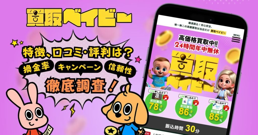 電子ギフト券買取業者『買取ベイビー』は、高換金率での取引・スピーディーな振り込み対応を求めている方におすすめの業者です。 Amazonギフト券やAppleギフトカードなど、日常的に利用される14銘柄に対応し、最短即日で振り込みを実現してくれます。 業界... -